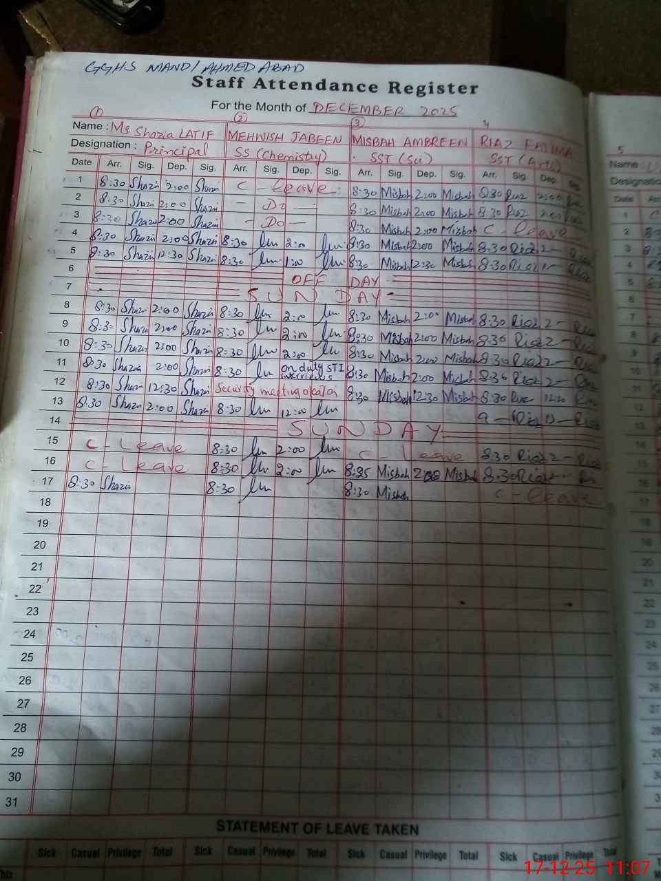 | CNIC | Full Name | Designation | R/C | Absence During Last Calender Month |