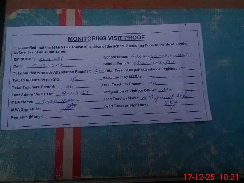 | EMIS Code: 34130086 | Name of School: GPS FAIZ-E-MUHAMMADI | |||