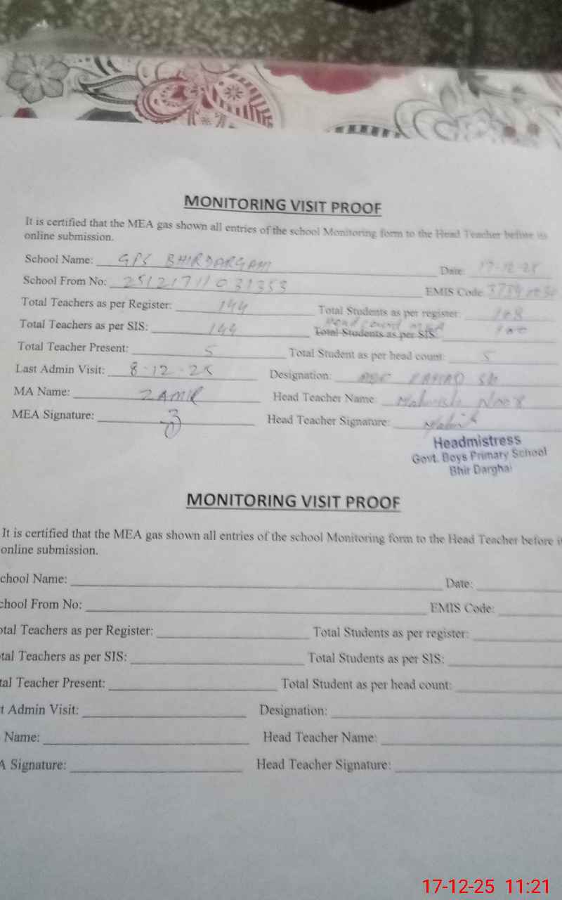 | Attendance Register | Head Teacher | MEA with School | Visit Proof |