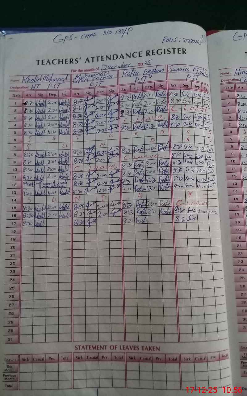 | 31**** | Sh**** Sa**** | PST Science/Maths | Regular | 0 | 0 | 30 | 0 | 0 | 0 | 0 | 0 | 0 | Absent (Un-Authorized) |