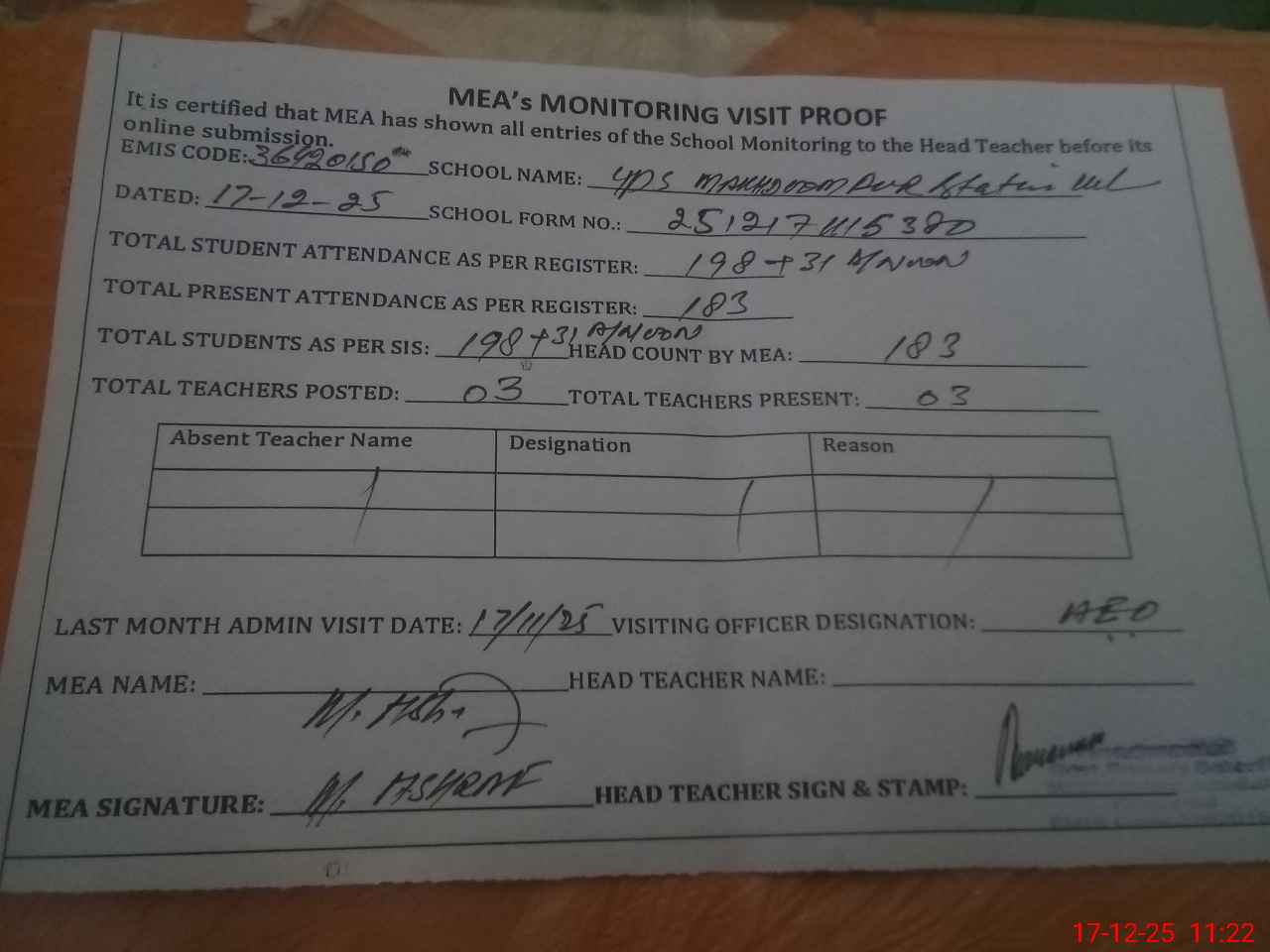 | Attendance Register | Head Teacher | MEA with School | Visit Proof |