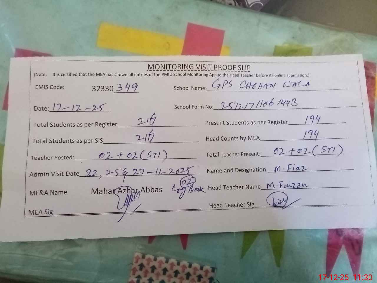 | Attendance Register | Head Teacher | MEA with School | Visit Proof |