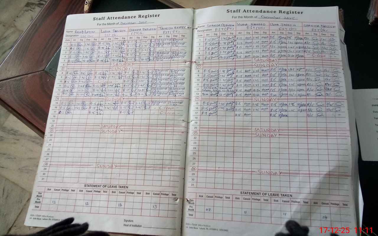 | CNIC | Full Name | Designation | R/C | Absence During Last Calender Month |
