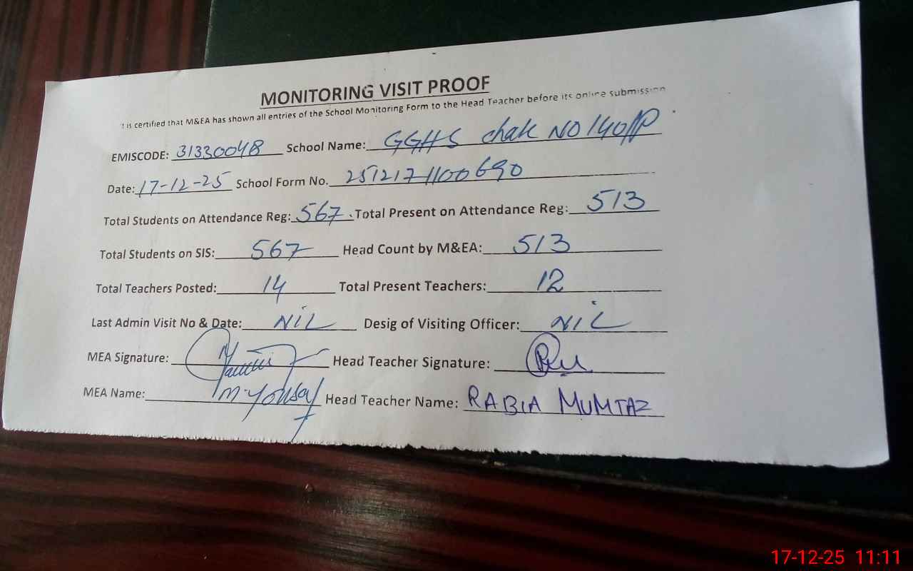 | EMIS Code: 31330048 | Name of School: GGHS CHAK NO. 140/P | |||