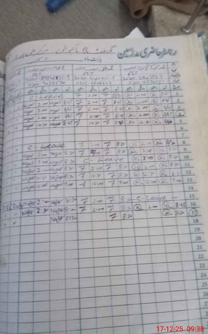 | CNIC | Full Name | Designation | R/C | Absence during last cal. month |