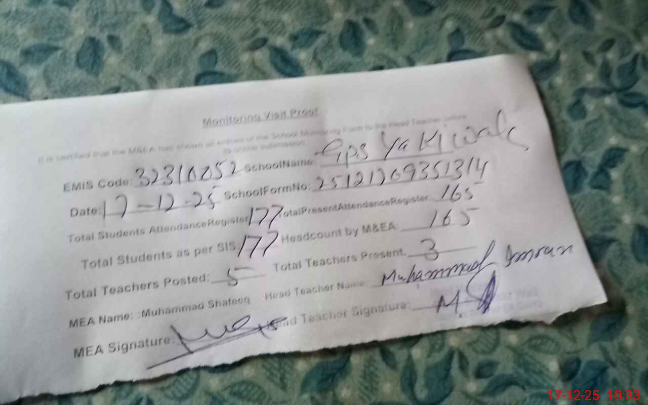 | Attendance Register | Head Teacher | MEA with School | Visit Proof |