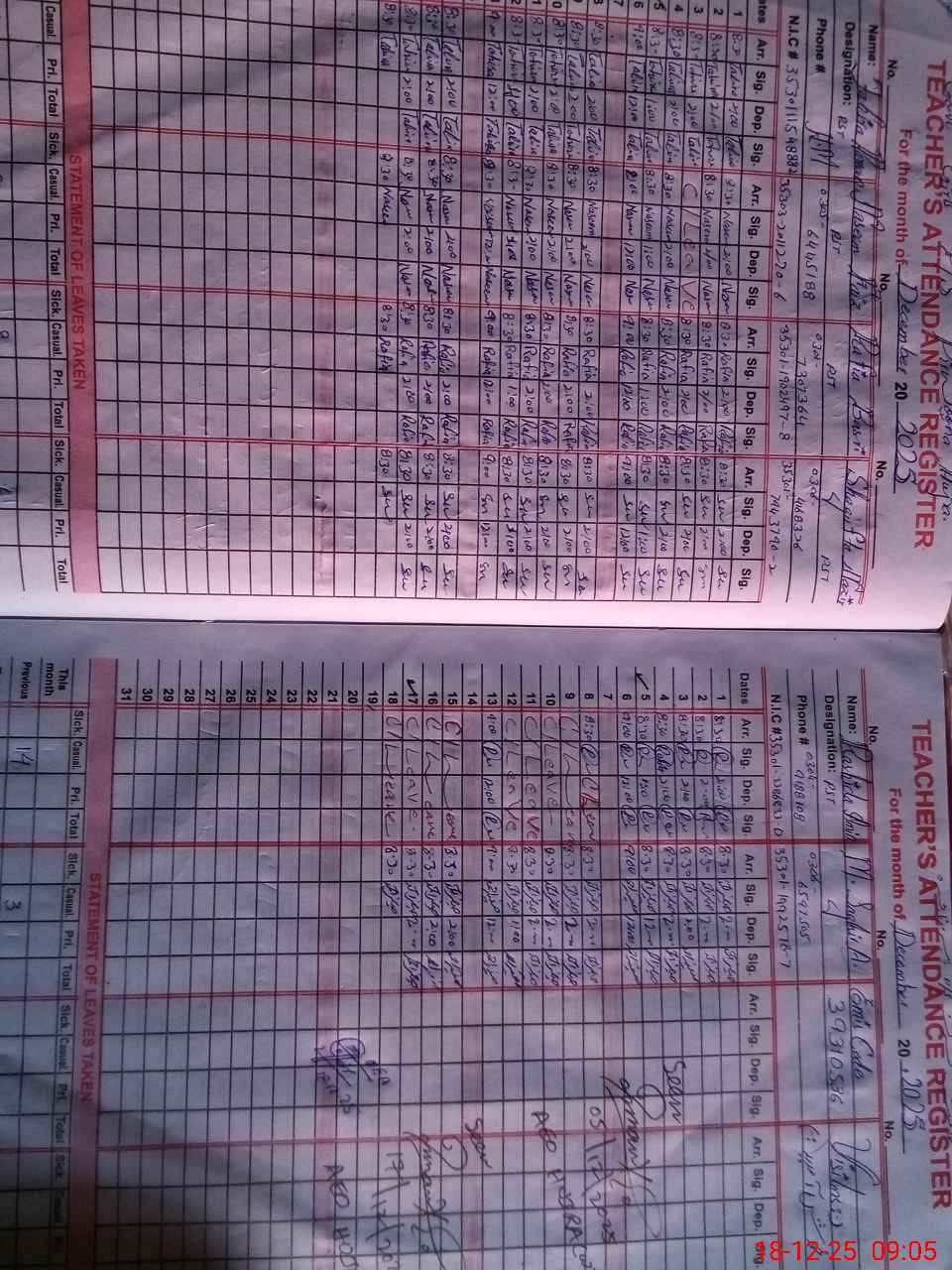 | CNIC | Full Name | Designation | R/C | Absence During Last Calender Month |