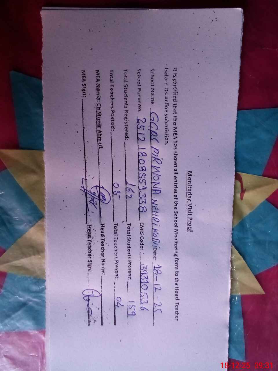 | Attendance Register | Head Teacher | MEA with School | Visit Proof |