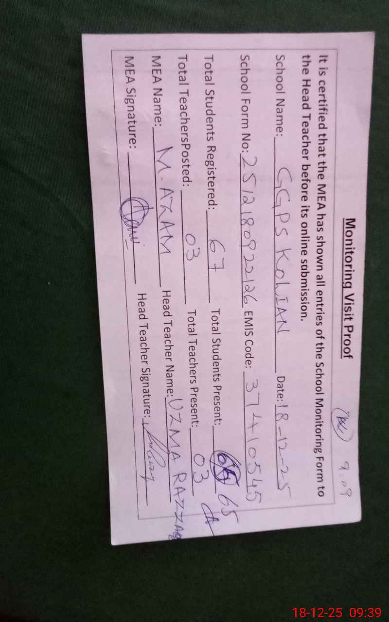 | EMIS Code: 37410545 | Name of School: GGPS KOLAIN PO CHAKORA CHAKWAL | |||