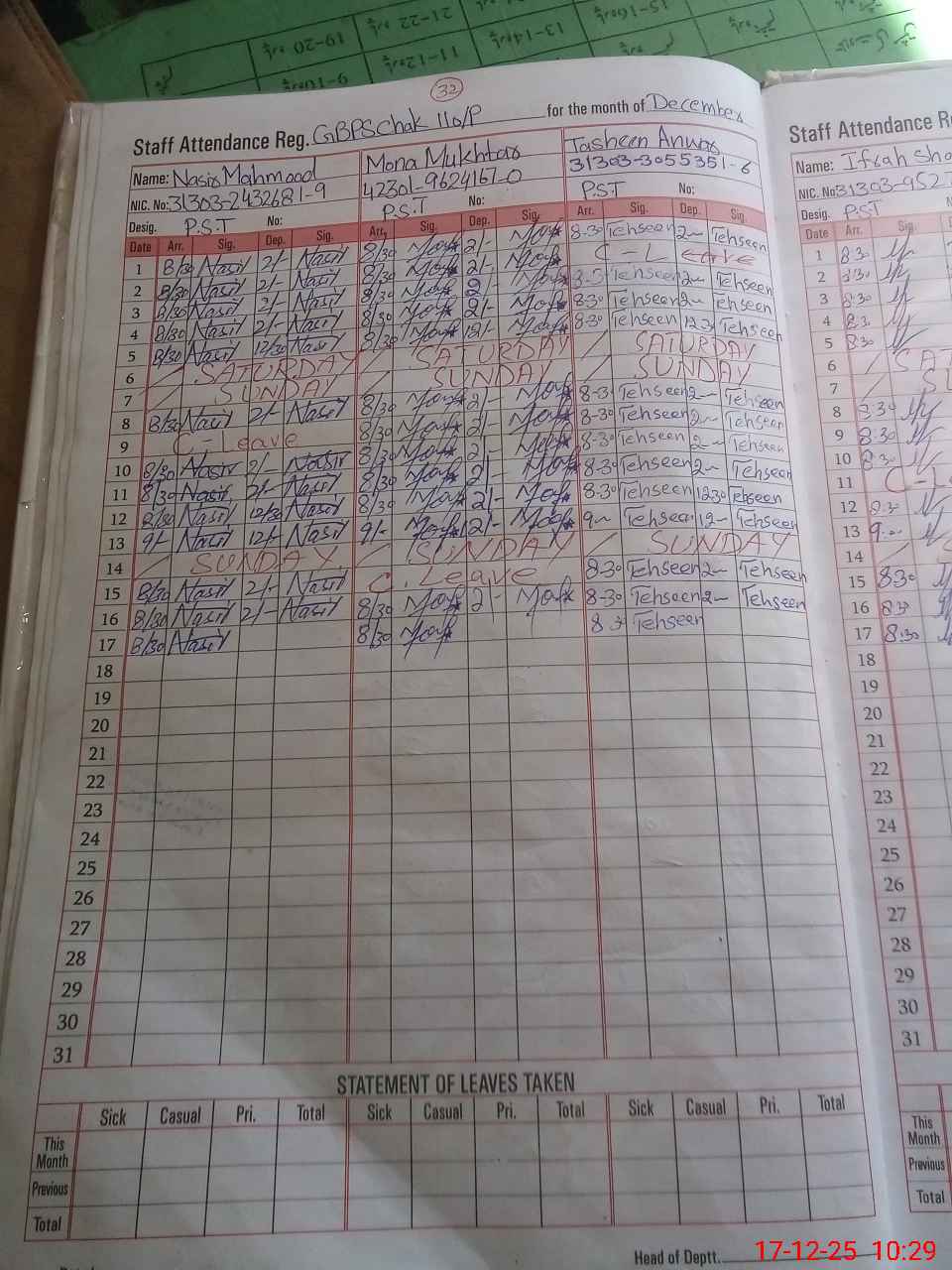 | CNIC | Full Name | Designation | R/C | Absence During Last Calender Month |