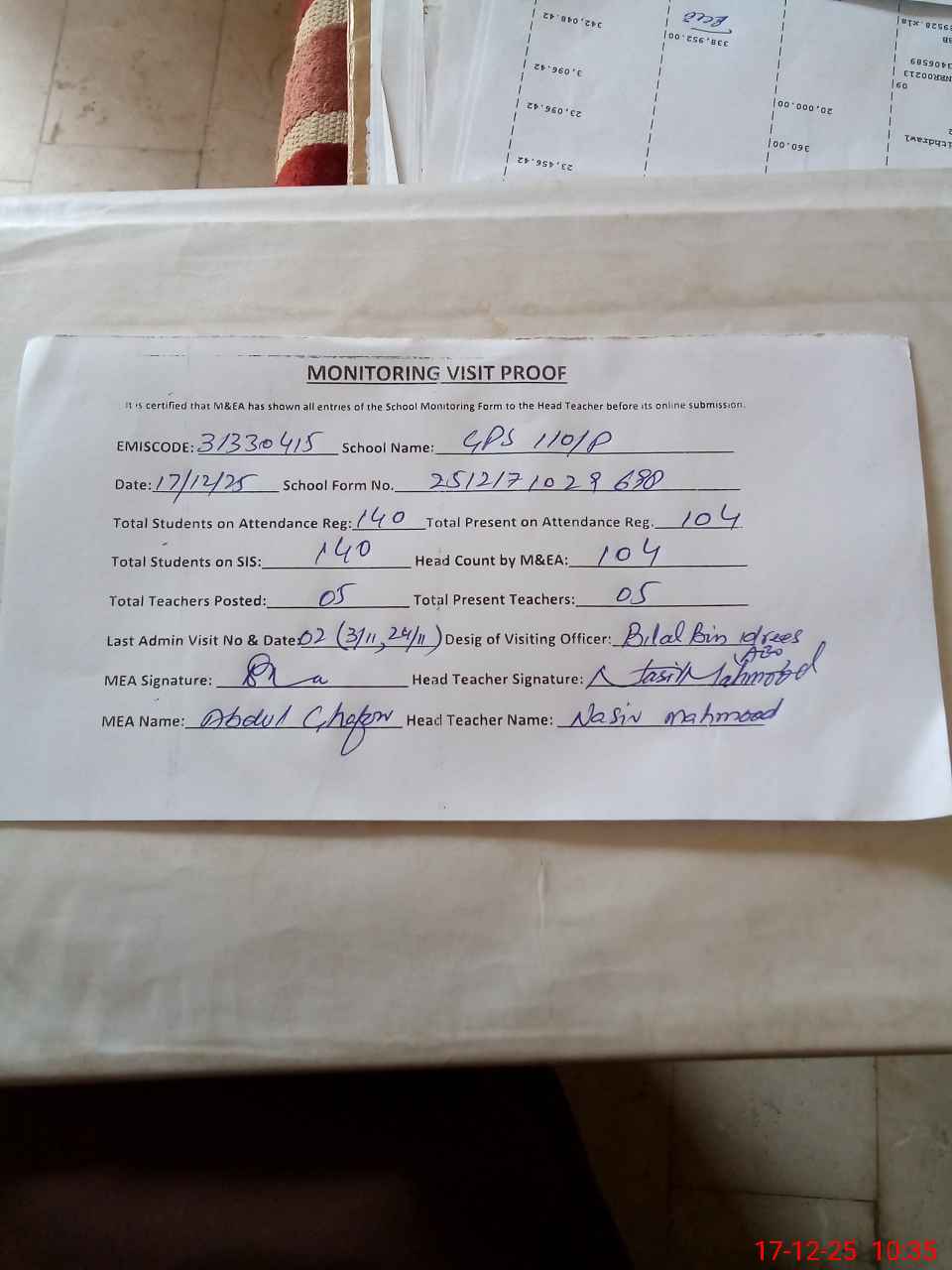 | Attendance Register | Head Teacher | MEA with School | Visit Proof |