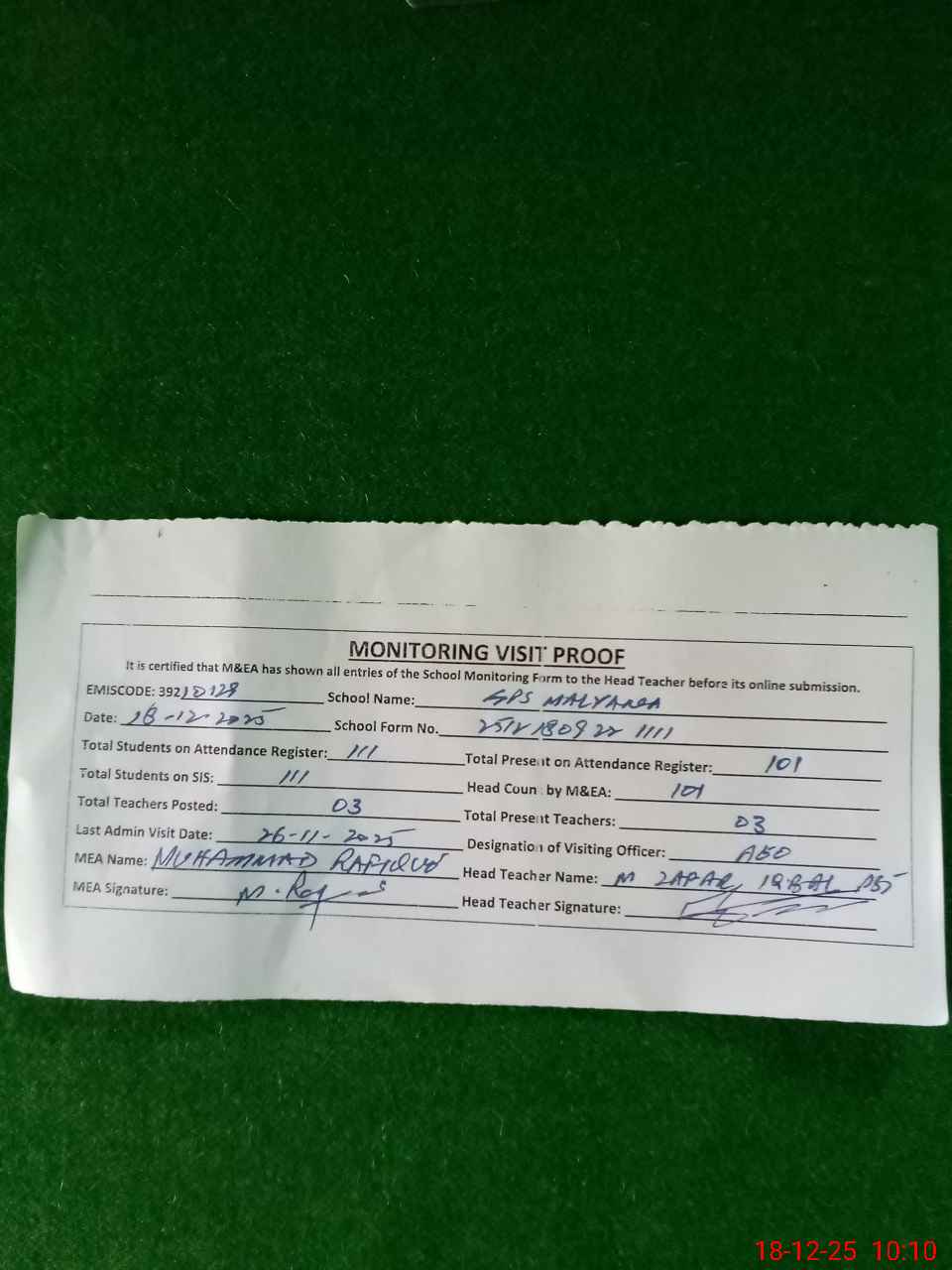 | Monitoring Date: 18-12-2025 | Start Time: 18-12-2025 09:22 AM | End Time: 18-12-2025 10:13 AM | Name of MEA: Mu**** Ra**** | |