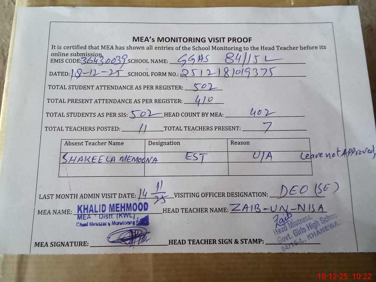 | EMIS Code: 36430039 | Name of School: GGHS 84/15-L, MIAN CHANNU | |||