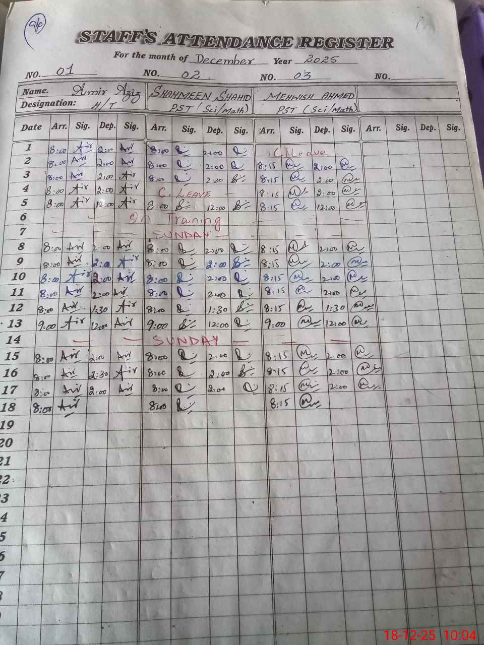 | CNIC | Full Name | Designation | R/C | Absence during last cal. month |