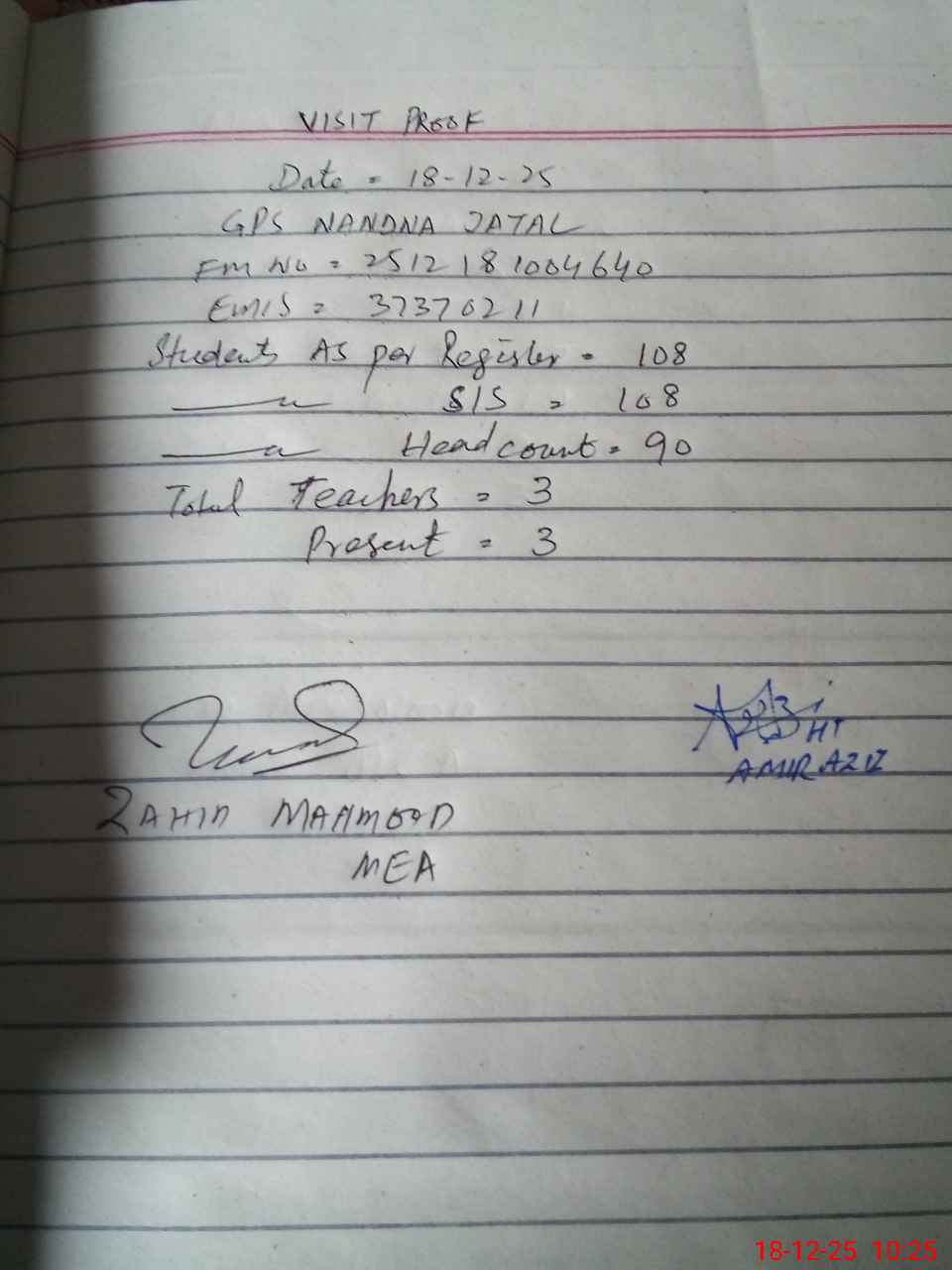 | Attendance Register | Head Teacher | MEA with School | Visit Proof |