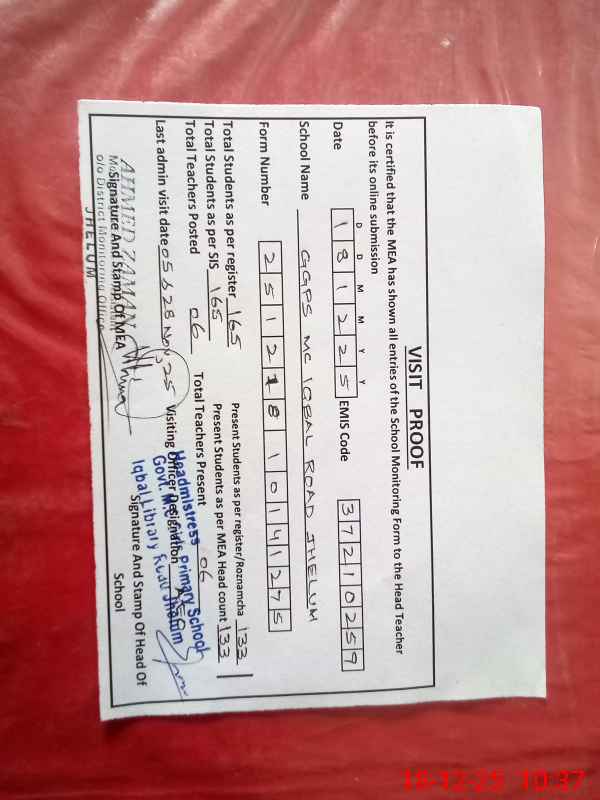 | EMIS Code: 37210259 | Name of School: GGPS MC IQBAL ROAD JHELUM | |||