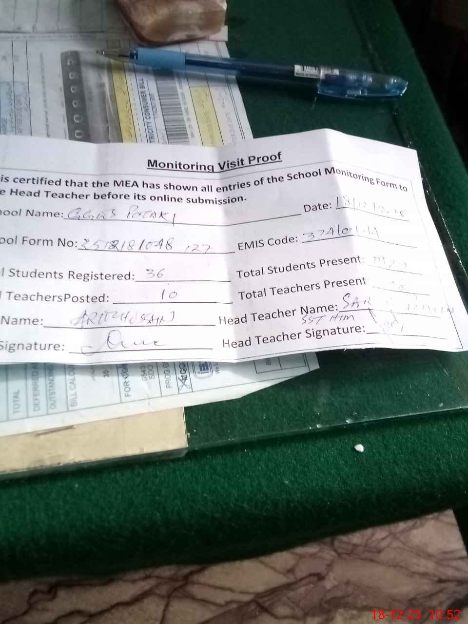 | Attendance Register | Head Teacher | MEA with School | Visit Proof |