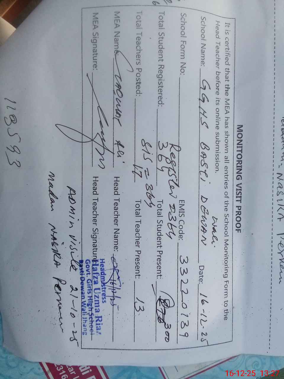 | EMIS Code: 33220139 | Name of School: GGHS BASTI DEWAN WALI | |||