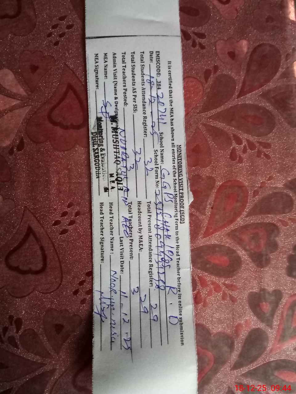 | Attendance Register | Head Teacher | MEA with School | Visit Proof |