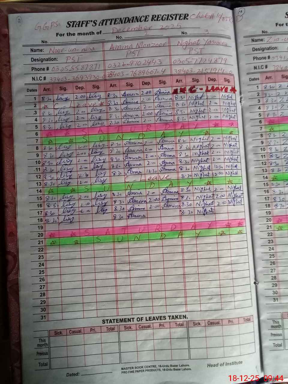 | CNIC | Full Name | Designation | R/C | Absence During Last Calender Month |