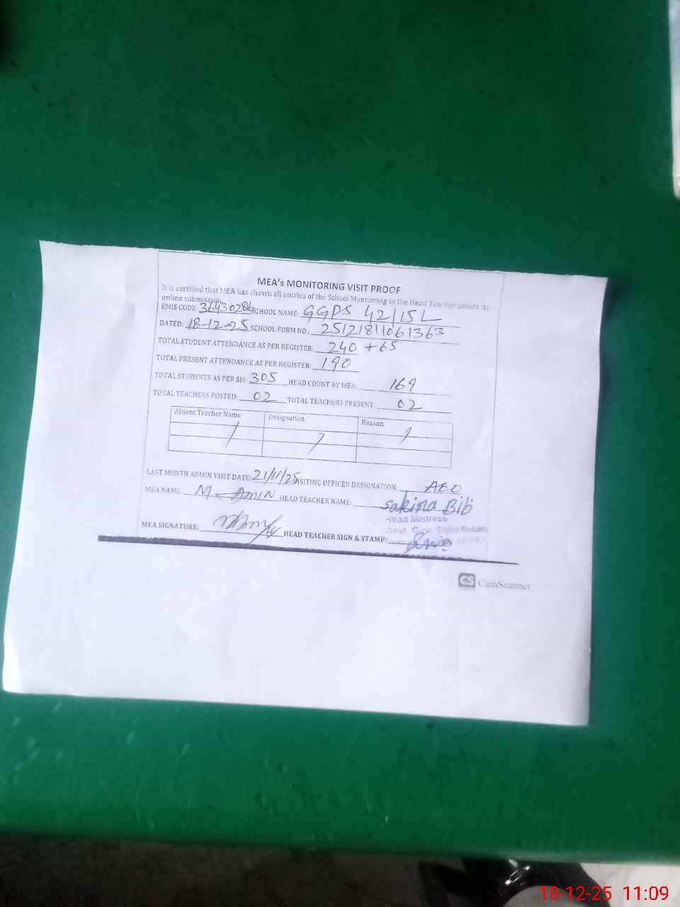 | Attendance Register | Head Teacher | MEA with School | Visit Proof |