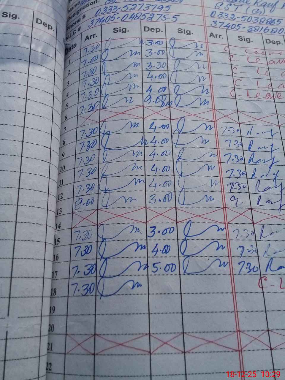 | CNIC | Full Name | Designation | R/C | Absence during last cal. month |