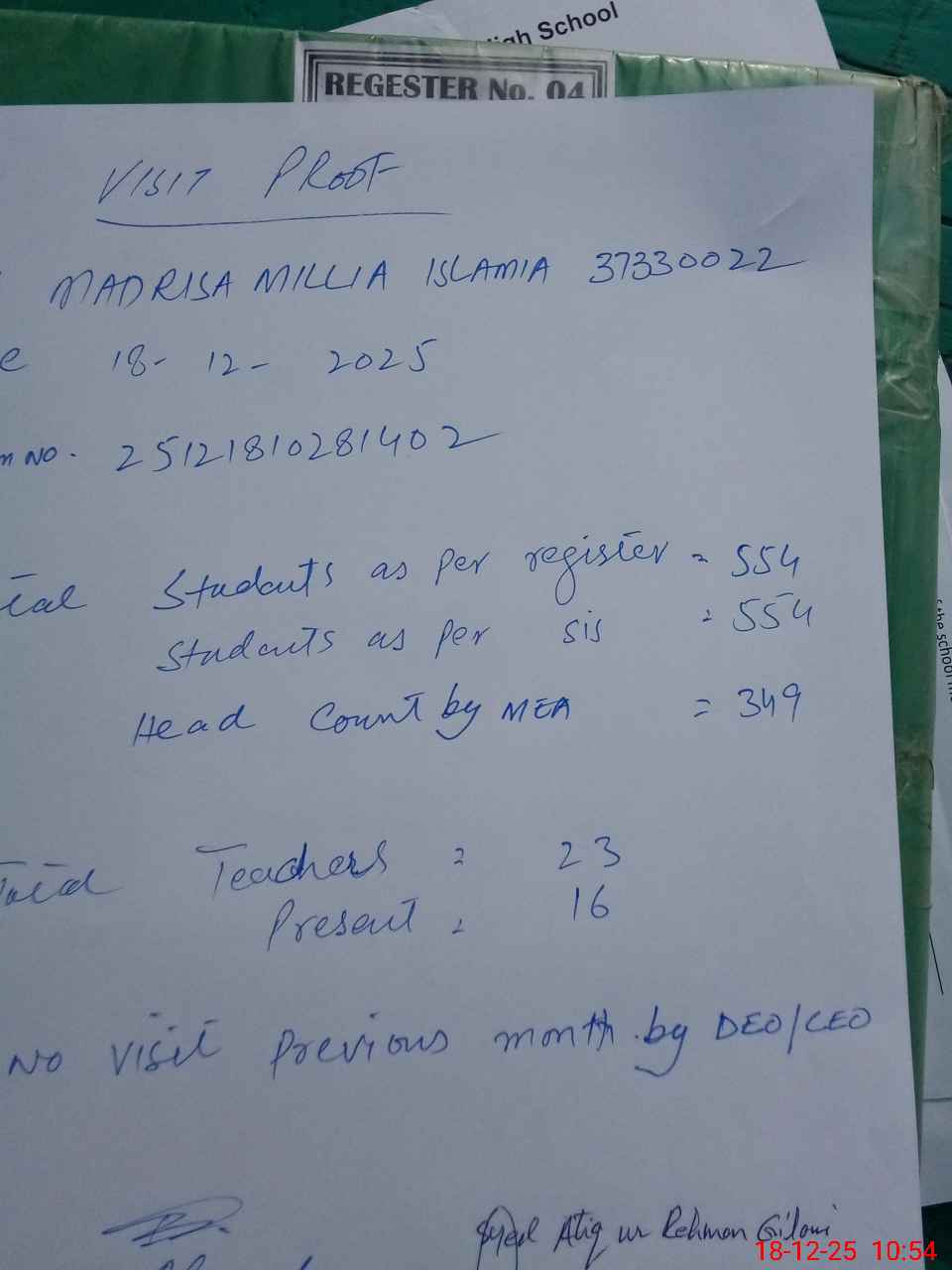 | Attendance Register | Head Teacher | MEA with School | Visit Proof |