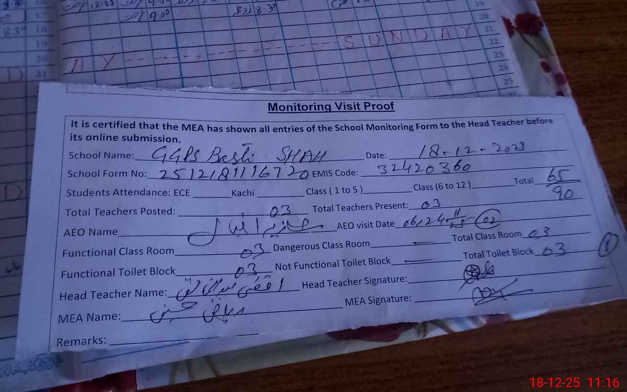 | Attendance Register | Head Teacher | MEA with School | Visit Proof |