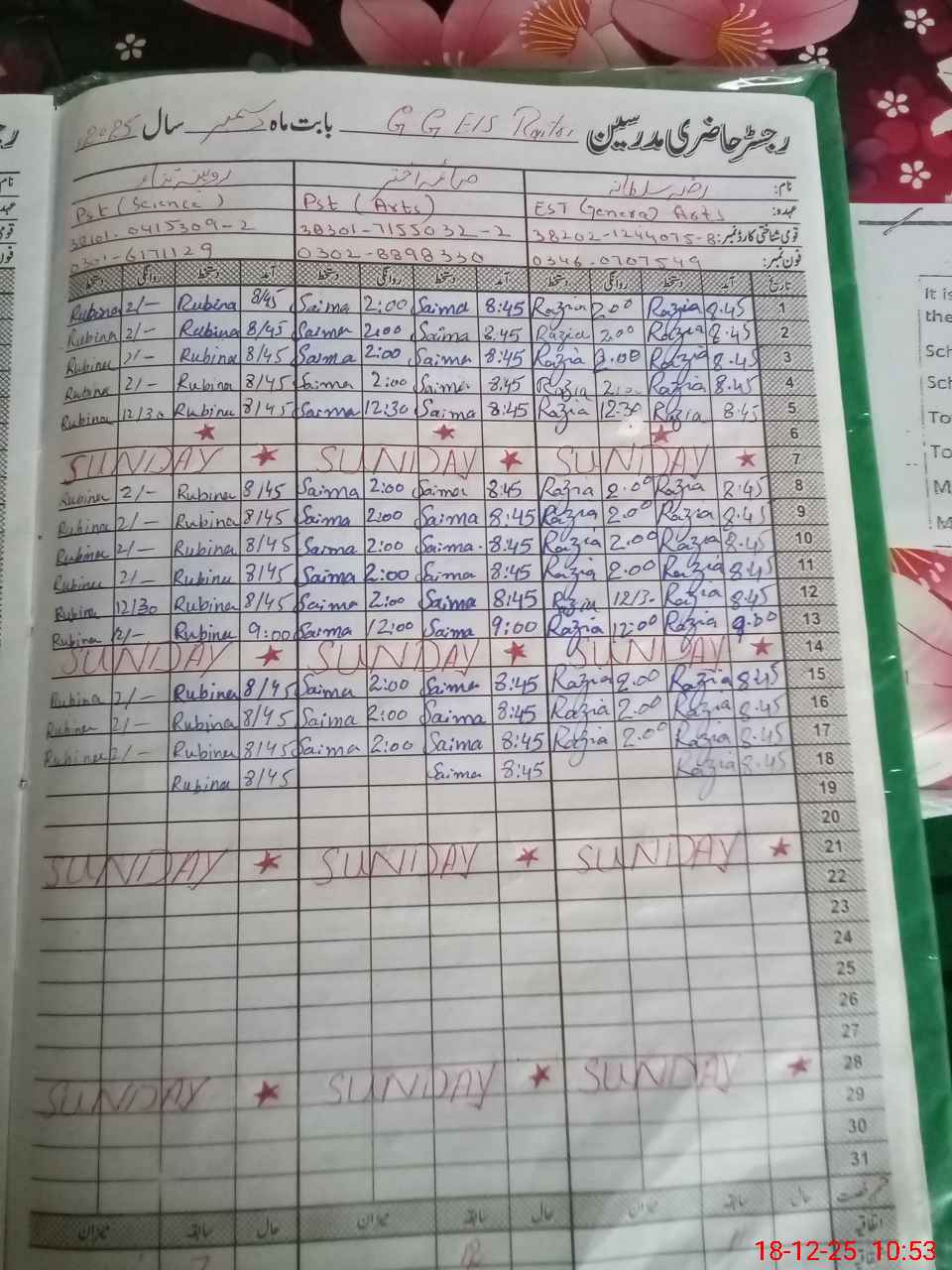 | CNIC | Full Name | Designation | R/C | Absence During Last Calender Month |
