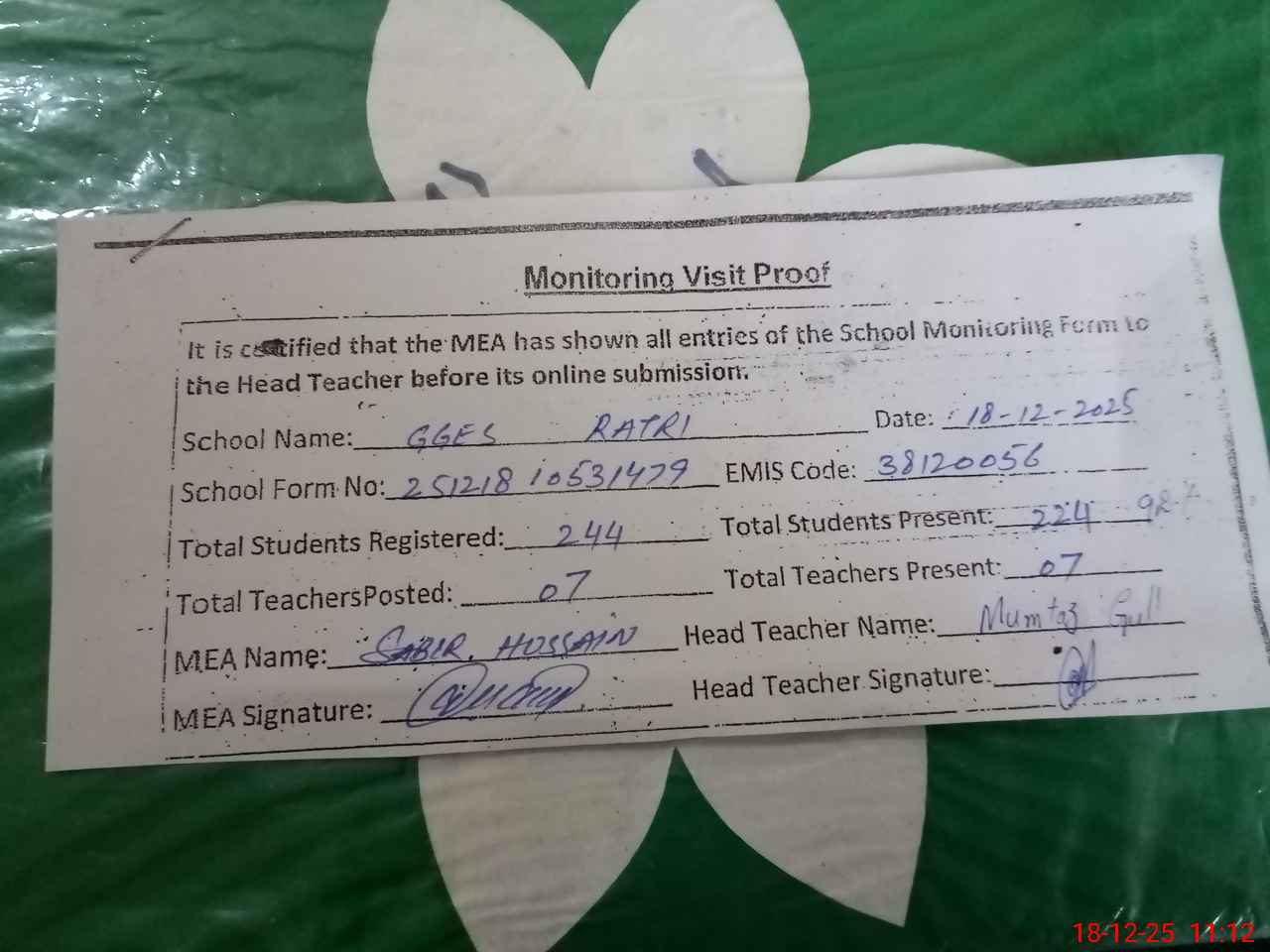 | Attendance Register | Head Teacher | MEA with School | Visit Proof |