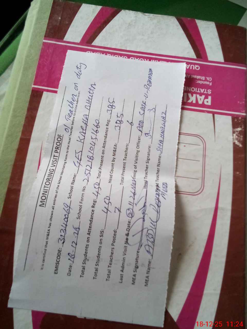 | Attendance Register | Head Teacher | MEA with School | Visit Proof |