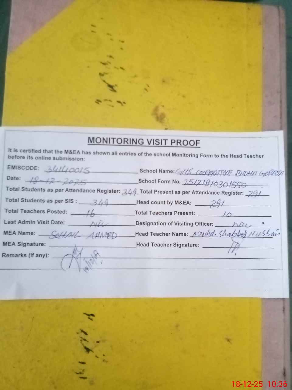 | EMIS Code: 34140015 | Name of School: GHS CO-OPERATIVE BUDHA GORAYA | |||