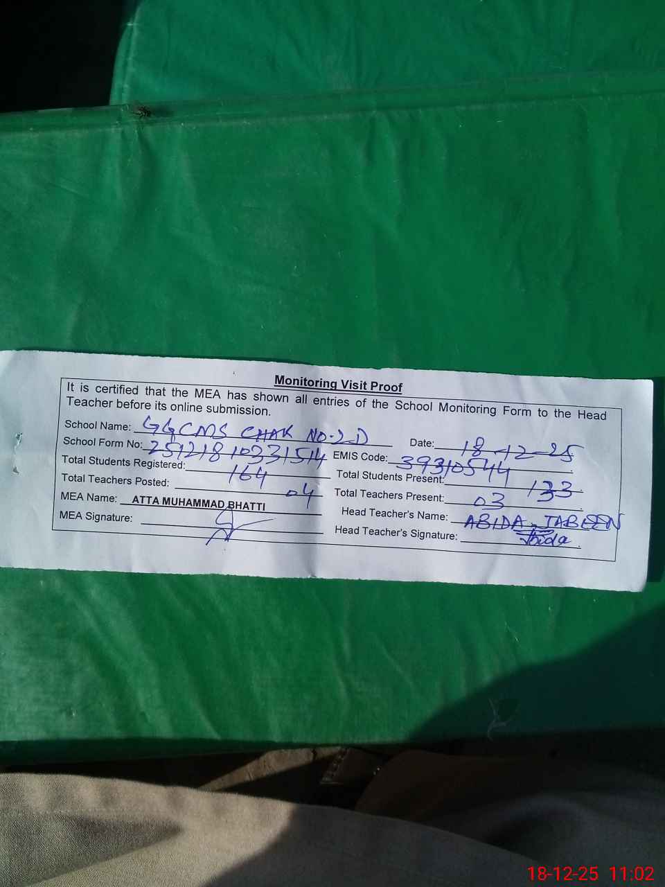 | Attendance Register | Head Teacher | MEA with School | Visit Proof |