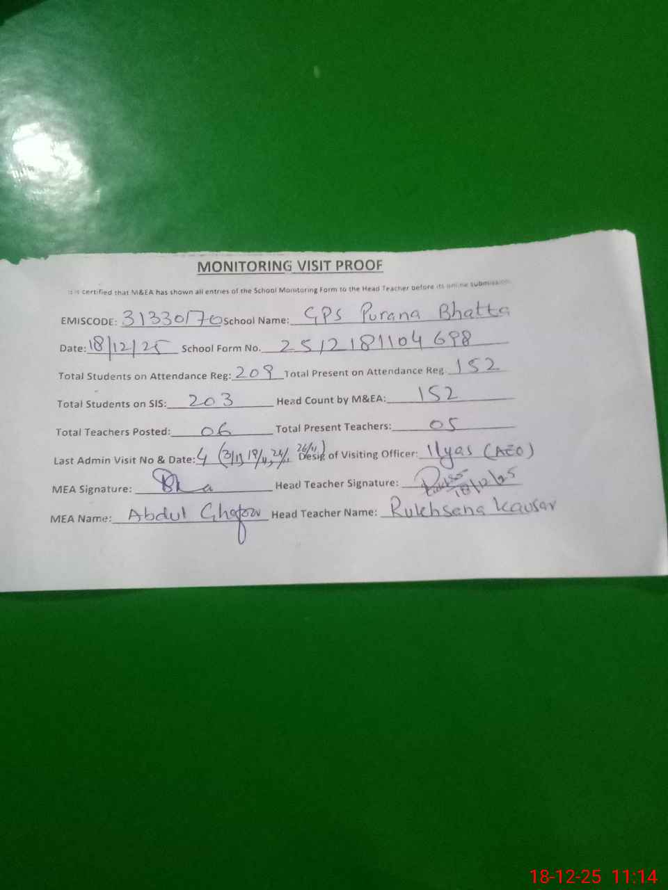 | Attendance Register | Head Teacher | MEA with School | Visit Proof |