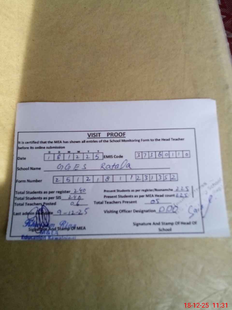 | Attendance Register | Head Teacher | MEA with School | Visit Proof |
