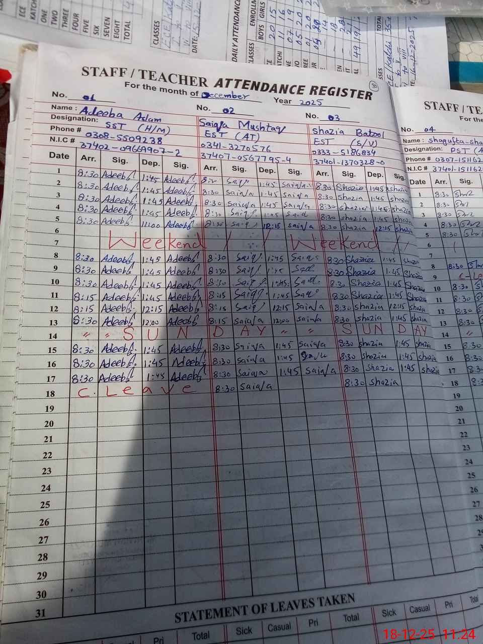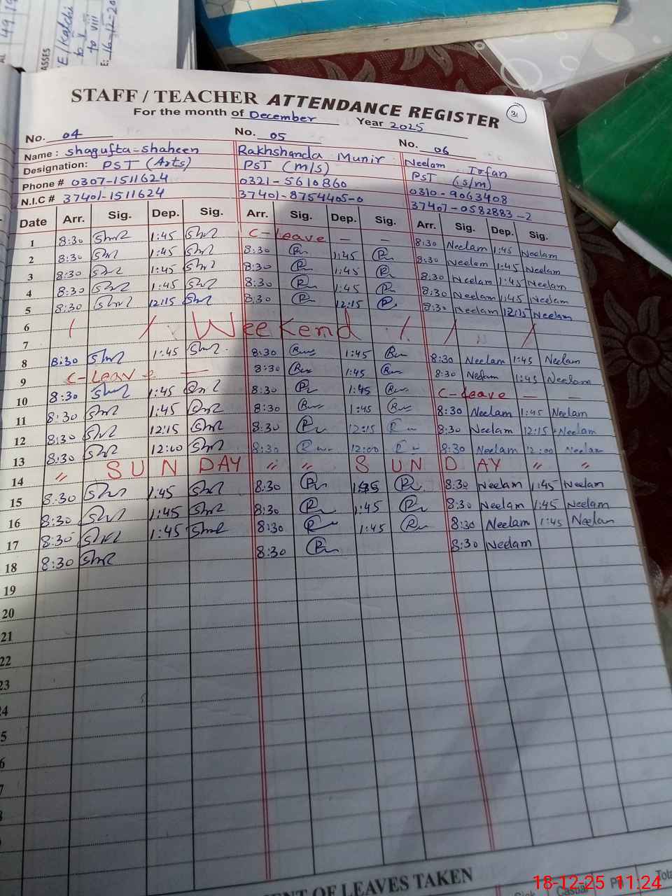 | CNIC | Full Name | Designation | R/C | Absence During Last Calender Month |