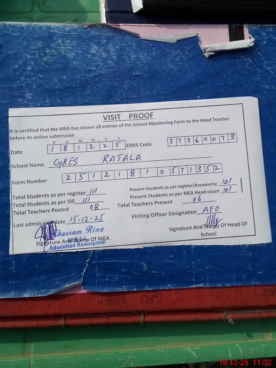 | Attendance Register | Head Teacher | MEA with School | Visit Proof |