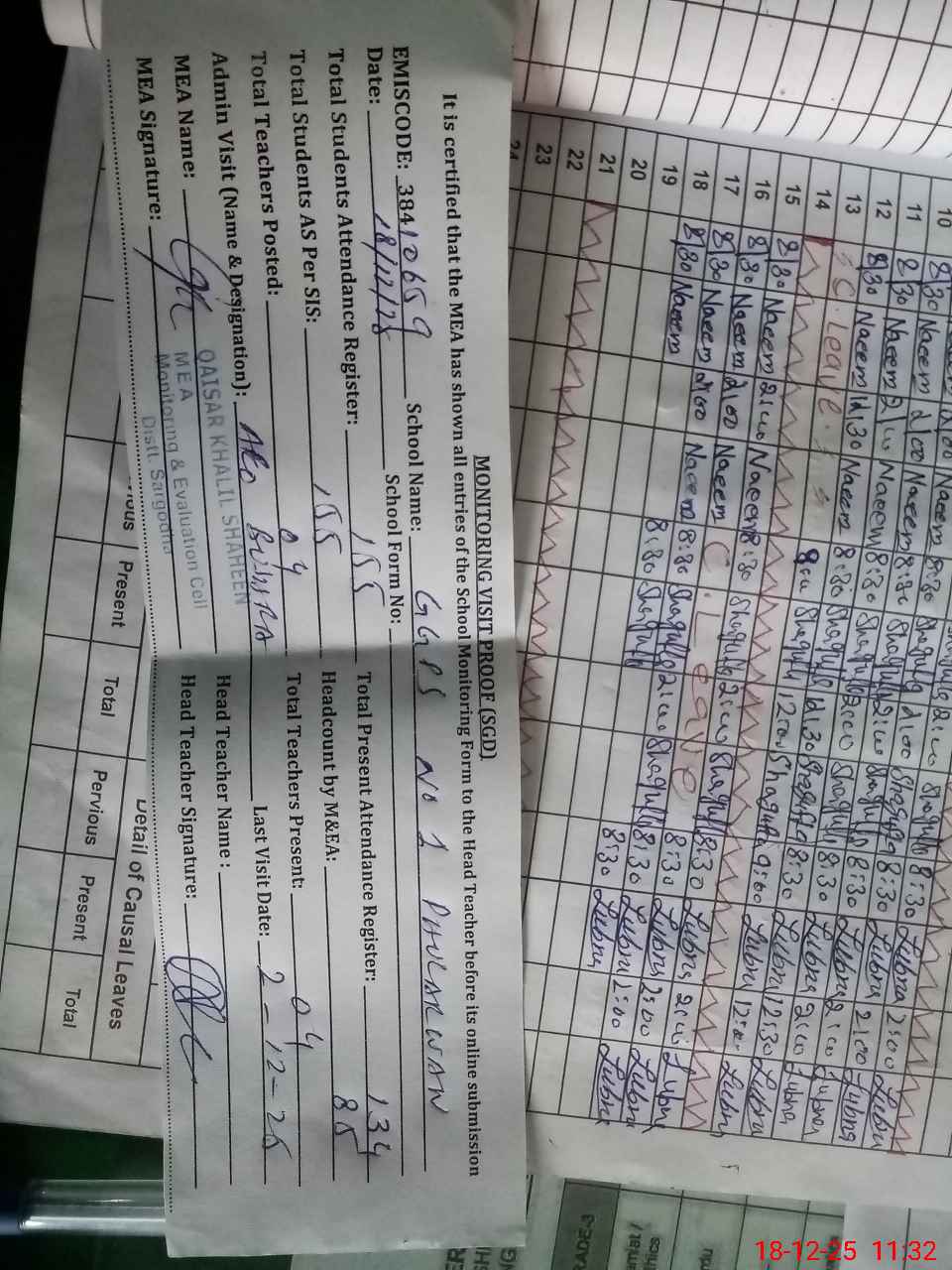 | Attendance Register | Head Teacher | MEA with School | Visit Proof |