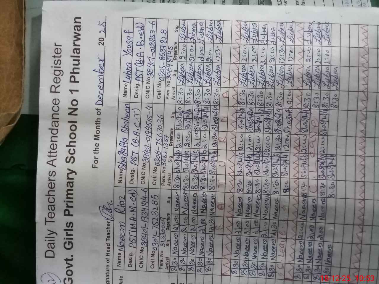 | CNIC | Full Name | Designation | R/C | Absence During Last Calender Month |