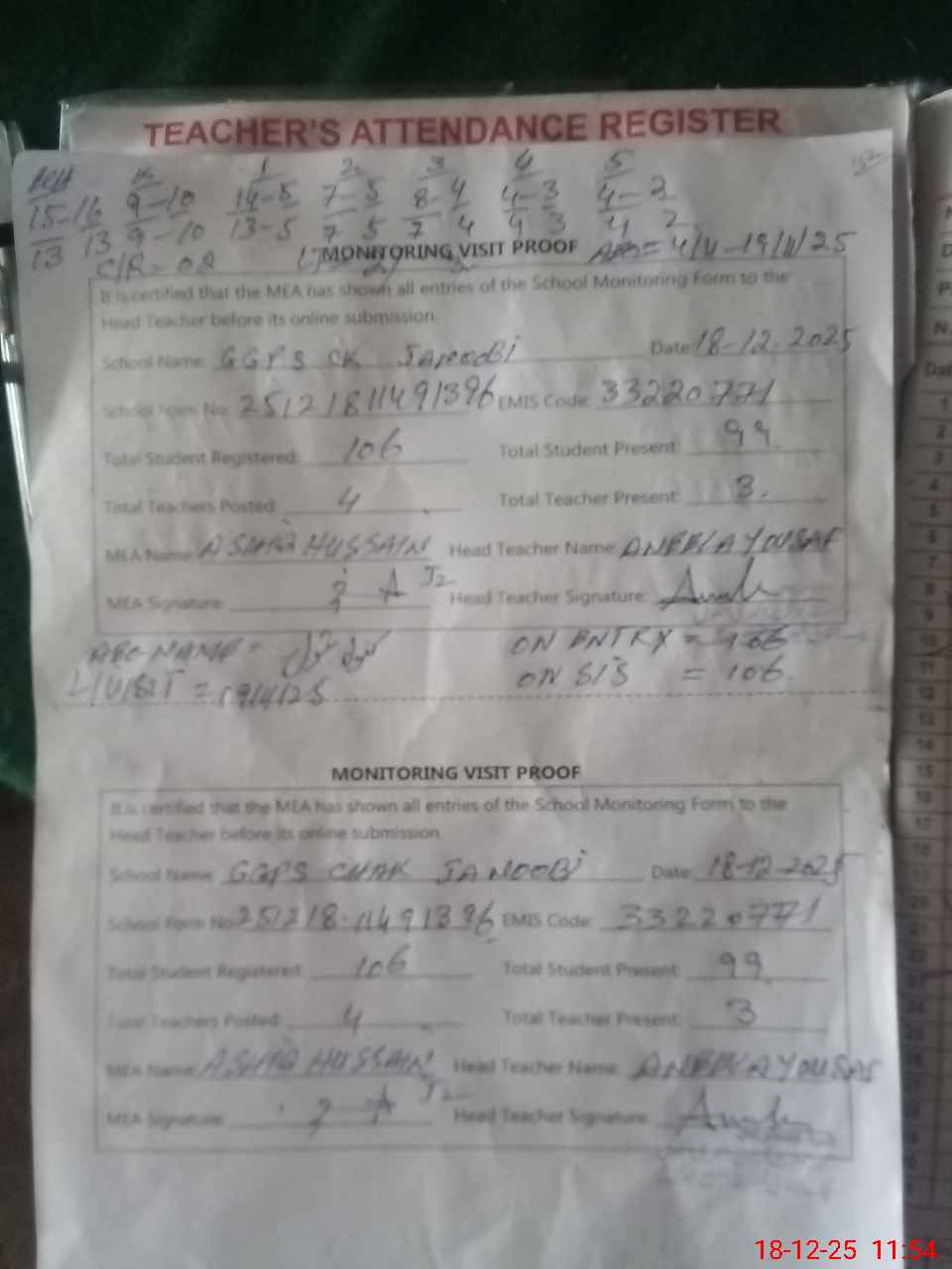 | Attendance Register | Head Teacher | MEA with School | Visit Proof |