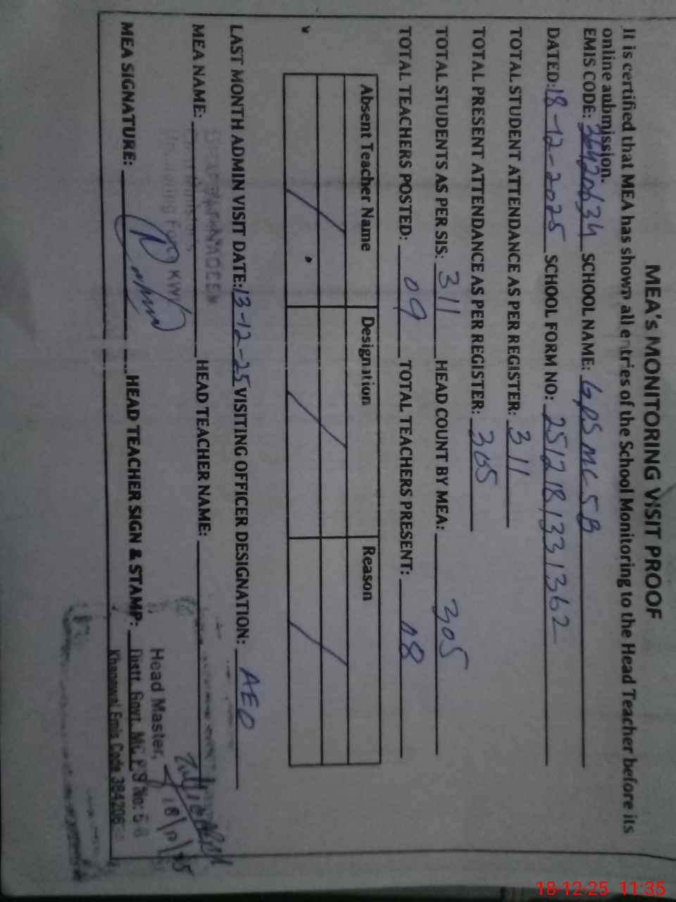 | Attendance Register | Head Teacher | MEA with School | Visit Proof |