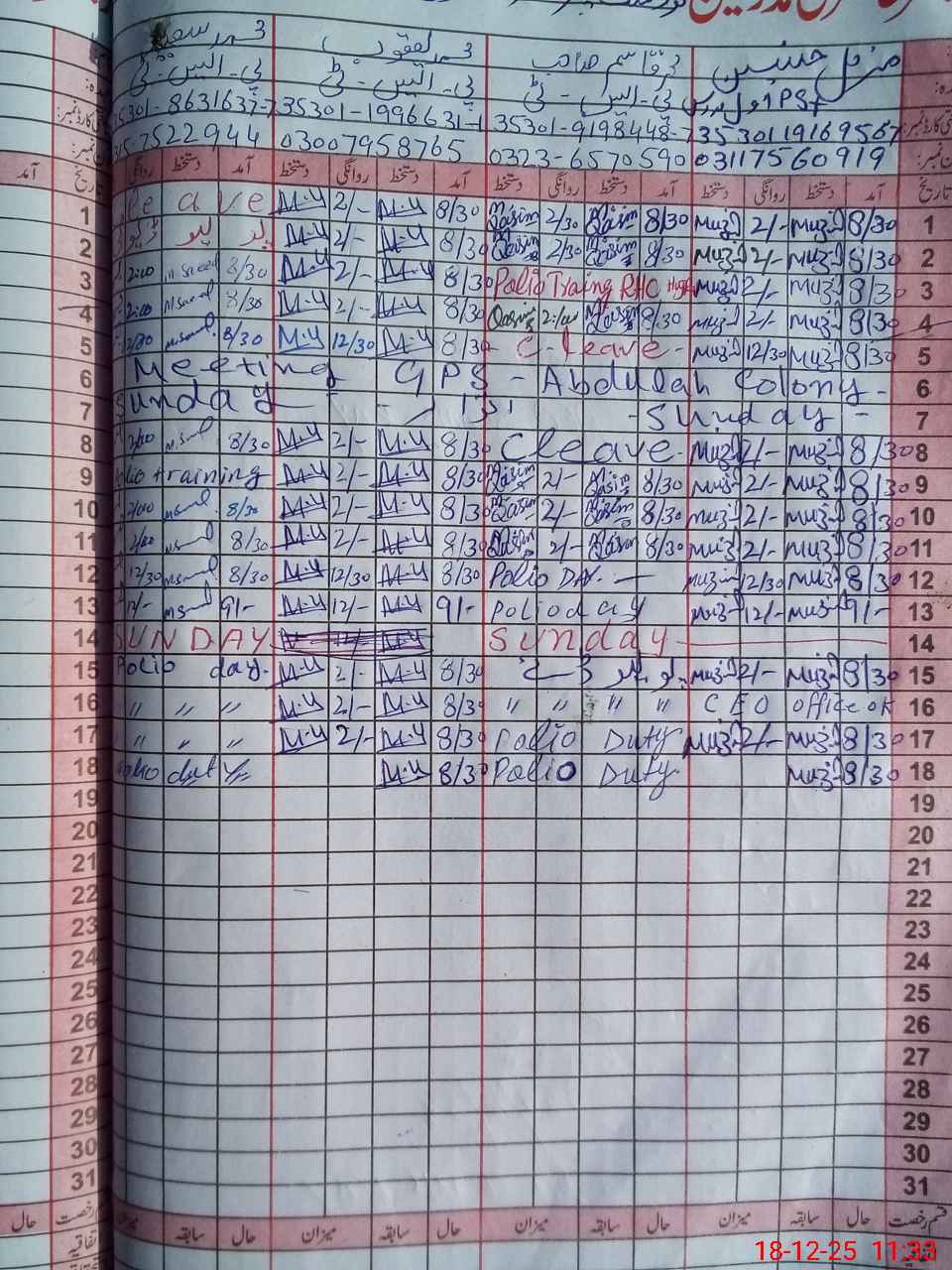 | CNIC | Full Name | Designation | R/C | Absence During Last Calender Month |