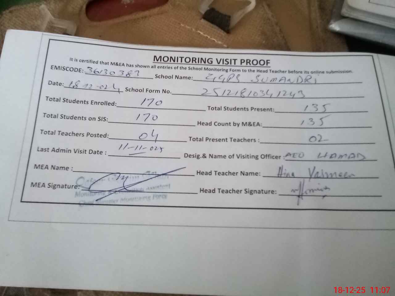 | Attendance Register | Head Teacher | MEA with School | Visit Proof |