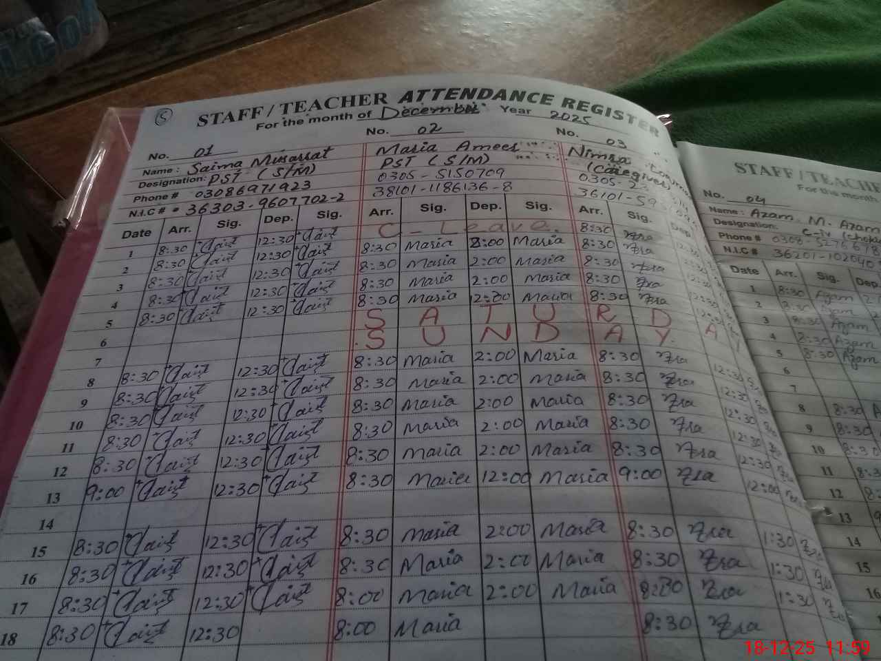 | CNIC | Full Name | Designation | R/C | Absence during last cal. month |