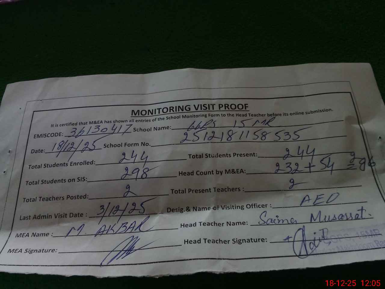 | Attendance Register | Head Teacher | MEA with School | Visit Proof |