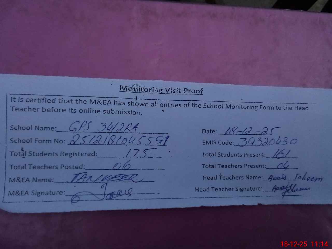 | EMIS Code: 39320430 | Name of School: GPS CHAK NO. 34/ 2-RA | |||