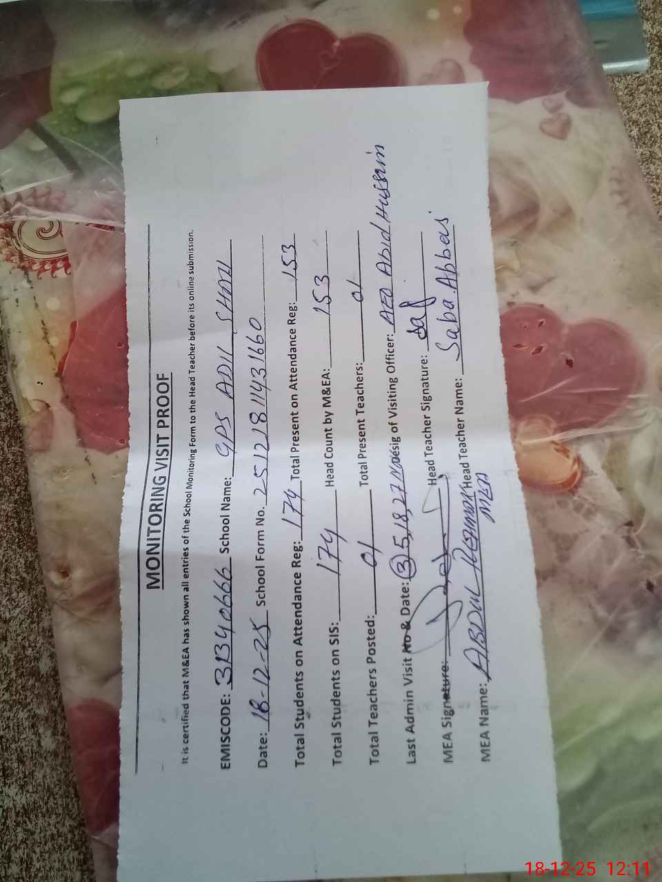 | Attendance Register | Head Teacher | MEA with School | Visit Proof |