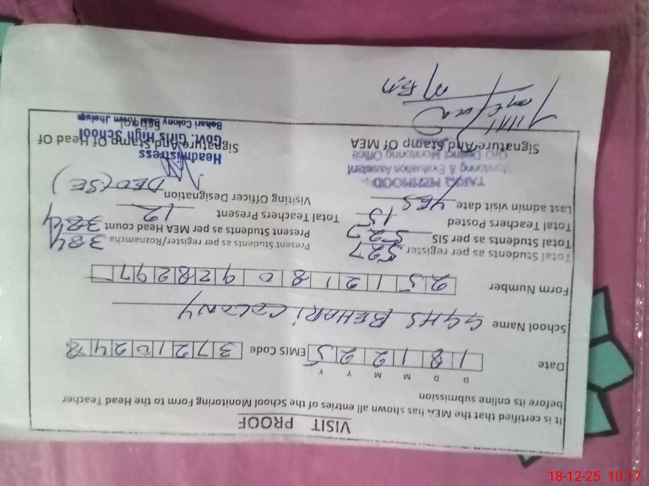 | Certified that this School was Inspected by the Undersigned MEA/DMO Today and the Information Stated Above is as Per Record. | |||||