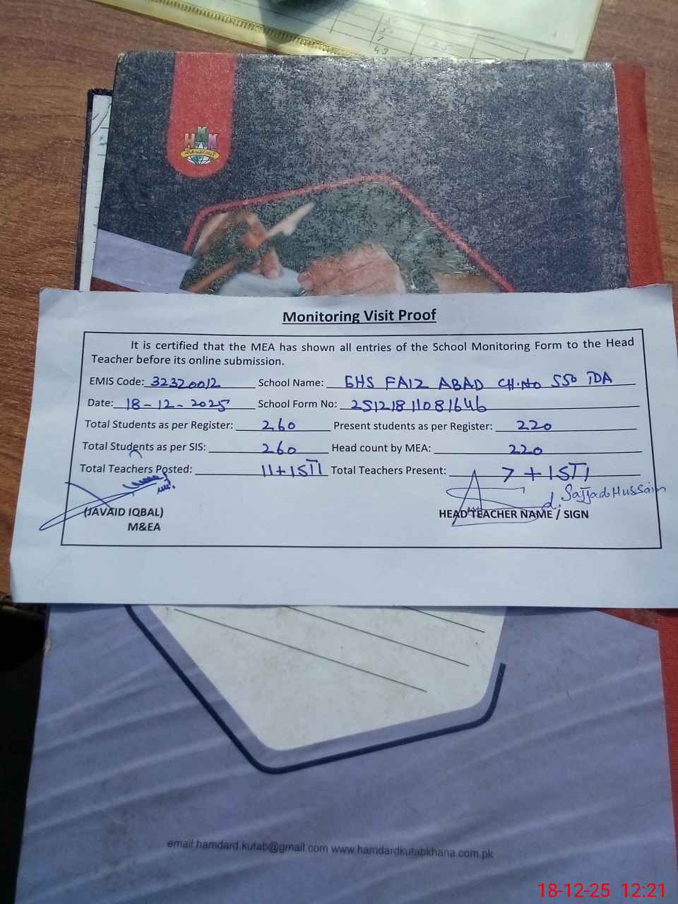 | Attendance Register | Head Teacher | MEA with School | Visit Proof |