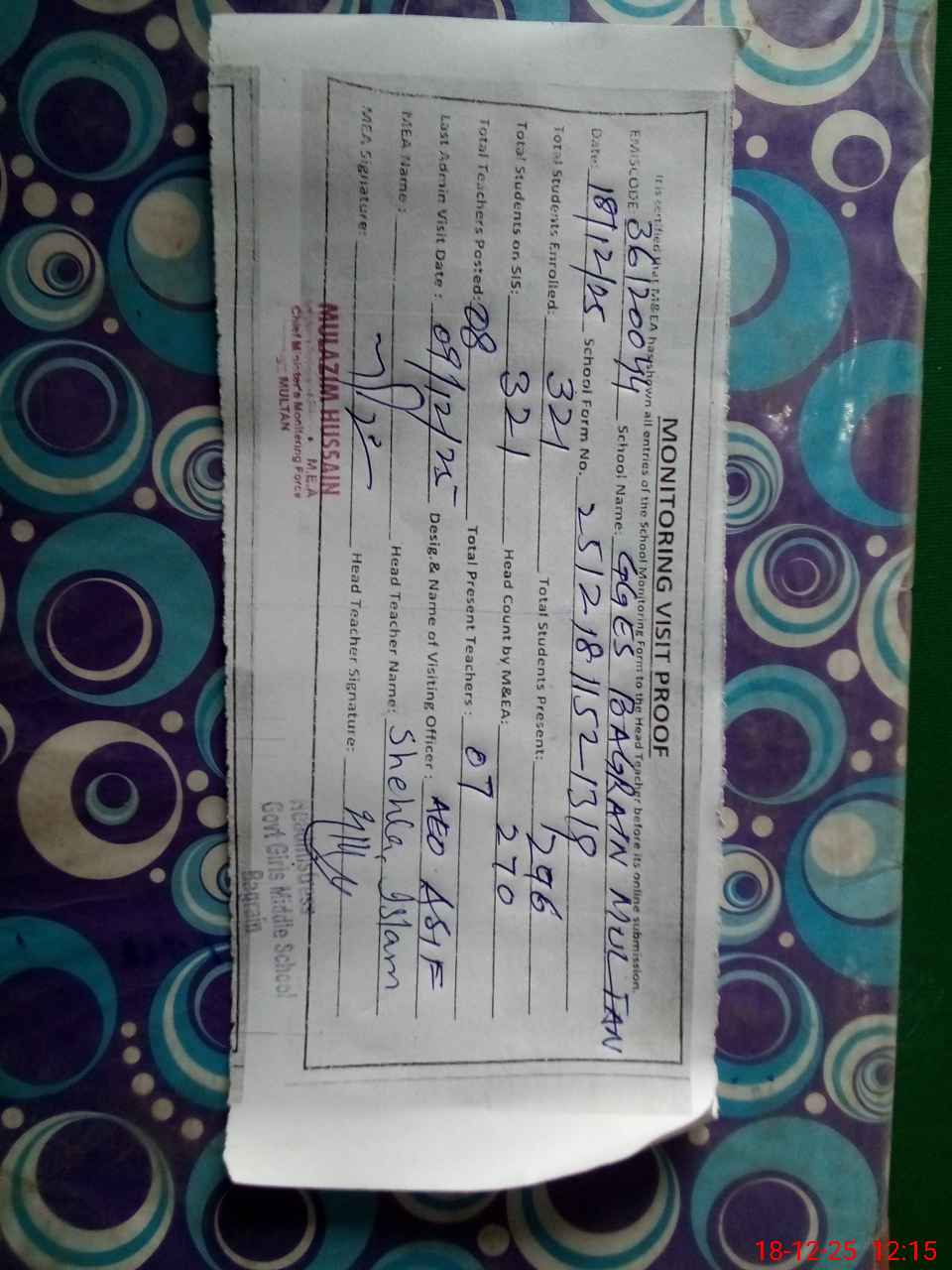 | Certified that this School was Inspected by the Undersigned MEA/DMO Today and the Information Stated Above is as Per Record. | |||||